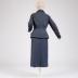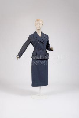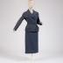 Grey wool with white weft thread double-breasted skirt suit with mother of pearl buttons and hemline pockets with flaps. "Christian Dior" signature silk damask brown lining. Matching pencil skirt has two vertical seams at the front, a rear vent, and fastens on the left side; double-breasted semi-fitted jacket, hip-length, has wide notch lapels (brooch is not original), fastens with two pairs of mother-of-pearl buttons and has two more on each sleeve, patch pockets with turn-ups are sewn onto the hem.