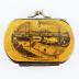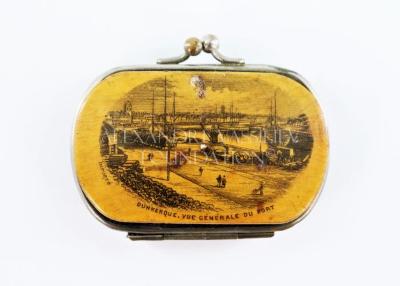 Souvenir money bag from Dunkerque made of olive wood and leather lined with blue silk inside. The cover is decorated with a general view on the port harbor.
