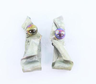 New Wave style artistic pair of ear clips handmade of silver painted bent mashed paper, imitating metal sheet, decorated with an iridescent round glass bead.