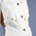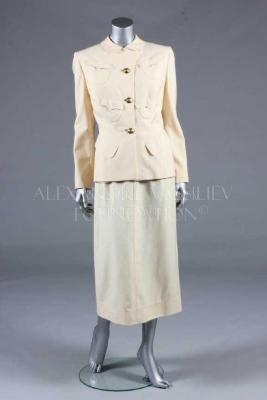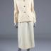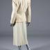 Women's ivory wool suit in military-style. Fitted jacket with padded shoulders, one short and one long lapel, three beaten gilt disc buttons, graduated patch pockets placed at an angle, faux hip pockets. Midi slim skirt.