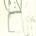 The face of the sketch depicts two women facing forward. One has a jacket with four buttons and elbow-length sleeves. The jacket has a fringed collar and a fringed bottom. She is wearing a skirt and a beaded necklace. Next to her, the other woman wears a coat with the same fringed collar and bottom. The coat however only has three buttons. One the back of the sketch, a woman is wearing a suit jacket with a single button and a knee length skirt. This suit is probably a preparatory drawing for the “Café de Flore” suit.