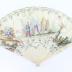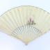 Painted leaf fan with 19 ivory sticks, carved and engraved with handpainted scrolled floral and vegetal motifs, with openwork detailing on the first and last sticks. Decorated on the handle with two mother of pearl circles from both sides. The main side is in paper with handpainted blue framing of red and yellow floral and vegetal ornaments, and decorated with a center scene representing a mythological allegory scene of two women standing with a Roman soldier dressed caracter. Another soldier is laying down on the left, and three heads wearing helmets are visible on the left background