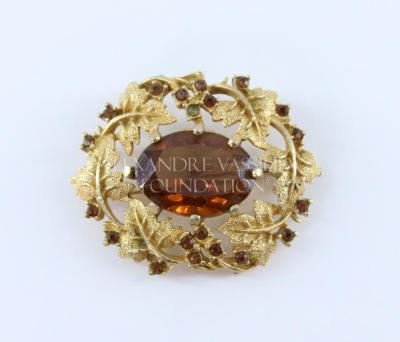 Large brooch, consisting of an oval topaz glass gemstone mounted on an openwork golden metal frame with vegetal ornaments of vine leaves embellished with small amber rhinestones. The brooch is a part of "Heritage" collection.