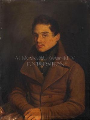 Painting of a man in the early Romantic Era. He is posing with his hands crossed over his lap, diagonally facing the viewer. The man wears a black neck-tie under a green, patterned vest. His overcoat features broad lapels, six buttons, and high collar. The man's hair is swept towards the front of his head, likely inspired by George Beau Brummell.