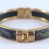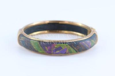 Cloisonne hinged bangle bracelet decorated on a brass base with wooden inserts, handpainted in fluo colours.