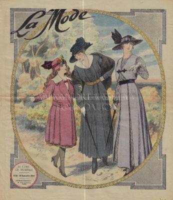 French fashion magazine “La Mode”, by "Le Petit Journal", n° 38, 19 September 1915. The total number of pages is 8 (including the front page and back page). The cover is embellished with coloured illustration of two women and a young girl, wearing outside gowns with knobsticks and hats.