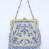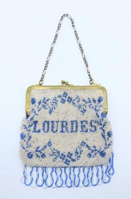 Rectangular beaded bag with brass clasp and chain handle, entirely embroidered with glass beads, forming on one side inscription "Lourdes" in a floral frame, blue on white, and vegetal motifs on the other side in the same colours. The purse is adorned with glass bead tassels on the bottom, and lined inside with ivory colour brocade.