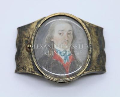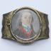 Brass mounted oval bracelet clasp with a miniature painting portrait of a man, after the French Revolution, wearing a brown coat with red waistcoat, white shirt and blue tie - colours of French national flag.