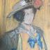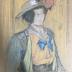 Portrait of a woman in a hat decorated with a rose, also in orange shirt with a white collar decorated with a blue bow