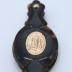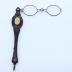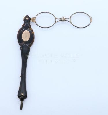 Pair of spectacles, in a dark brown colour tortoiseshell decorated with a golden medaillon engraved with little dot frame and a monogram, probably "AD".