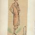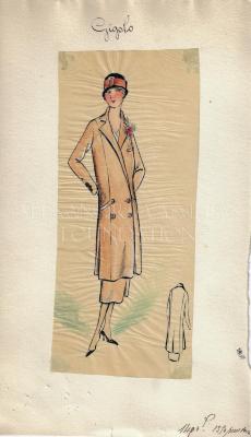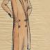 Chinese ink and gouache on tracing paper fashion sketch of a woman wearing a camel colour autumn coat with a small flower bouquet in the buttonhole, a cloche hat with large buckle, and a skirt or a dress. In the right bottom corner there is a smaller drawing of a back of the jacket.