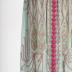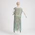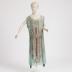 Sage green Russian-Egyptian style dress of crinkled chiffon, applied with lamé, embroidered with transparent and golden bugles, metallic and purple silk thread in Egyptian motifs; with ivory jersey slip.