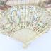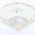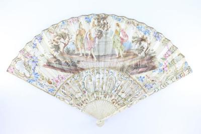 Fan with leaf made of paper and 22 ivory sticks, openwork, carved and handpainted with rococco floral design framing male and female caracters on mother of pearl background. The leaf is hand painted with gouache with a mythological scene, representing two soldiers in front of a woman in Antique Greek clothes holding a bow. The sides are handpainted with golden frame of scrolled motifs and multicolour flowers, the same floral decoration on the other side.