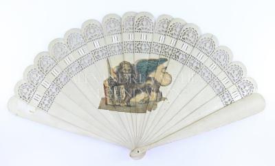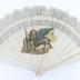 Fan entirely made of painted wood, consisting of 18 sticks, openwork and carved on the top with stylized floral rosettes. In the center, there is a glued print of the Lion of Saint Mark, representing Mark the Evangelist, pictured in the form of a winged lion, an aspect of the Tetramorph, the symbol of the city of Venice and formerly of the Venetian Republic. Inscription is saying: PAX TIBI MARCE EVANGELISTA MEVS (Peace unto you, Mark, my Evangelist).