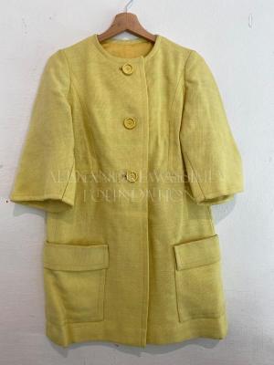 Yellow linen collarless coat with bracelet sleeves, patch pockets and three matching buttons front closing