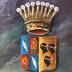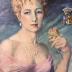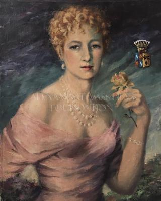 Painting portrait of a countess, originally from MOREAU de FAVERNEY noble family. The lady is represented in a pink evening dress with open shoulders, wearing a set of pearl jewellery consisting of a necklace, a bracelet, pending earrings, and a ring. She has a short haircut, and holding a rose on a blue sky background with a garden. On the right, a coat of arms, relating two noble families, is represented: on the left, quartered with silver feathers on blue in 1st and 4th, and golden sheaf of wheat on red in 2nd and 3rd; MOREAU de FAVERNEY on the right with three Moor's heads with silver and red headbands, on golden background - all surmounted with an earl crown.