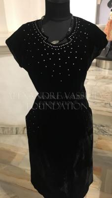 Black velvet cocktail dress with slash pockets and top front embellished with rhinestones. From Gloria Swanson Forever Young collection.