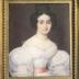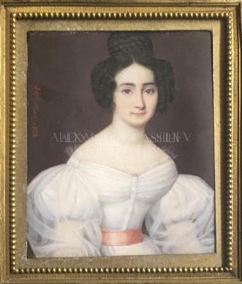 Miniature painting portrait of a young woman in a white ball gown, with large gigot sleeves, consisting of two layers - the outside longer layer in semi transparent organdi or gauze, and inside shorter sleeves in more opaque fabric. Wide V-neckline is trimmed with short lace border, and the tight waistline of the dress is accentuated with a salmon pink ribbon belt. The model is wearing a fashionable giraffe hairstyle with braided updo bun.