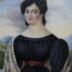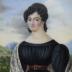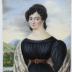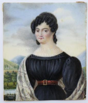 Miniature painting portrait of a young woman in a dark colour dress with long sleeves, accentuated on the waistline with a red belt with a rectangular buckle. She is wearing a pair of coral earrings, and a white cashmere shawl with pasley pattern. The woman is represented outside on a romantic landscape with mountains, river and a village.
