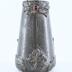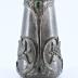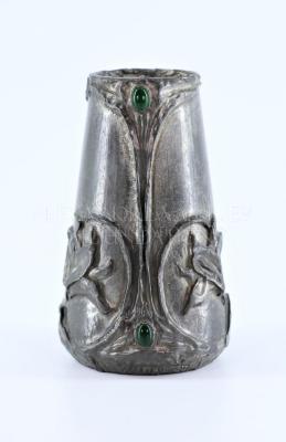Art Nouveau style small bouquet holder table vase covered with repoussé technique tin metal with green and red cabochons on the top and the bottom.