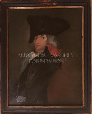 Reverse glass oil painting, representing a semi profile portrait of a young man, in a black tricorne hat made of fur with cockade, dark colour jacket with red lining on the collar. His hair are long and attatched in a braid on the back ending with a bow. The artwork comes with a similar portrait of the man's wife.