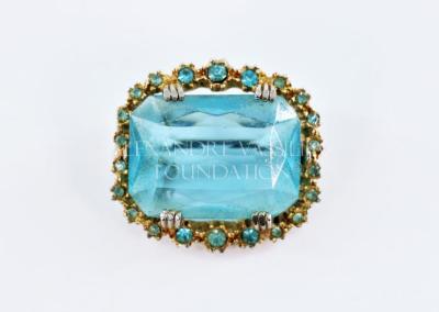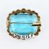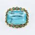 Small octogonal brooch consisting of a large transparent blue glass cabochon mounted on gilded metal base with tiny blue rhinestones.