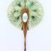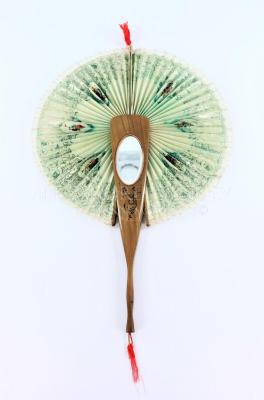 Sorrento ware cockade fan (Flabellum type) in olive wood inlaid with oval flirt mirror on one side and marquetry swallows on the other, handpainted with inscription in Italian "Ricordo" (Souvenir). The mechanism opens the fabric backed paper leaf out to make a full circle by pulling the small cord tab at the top.