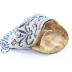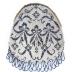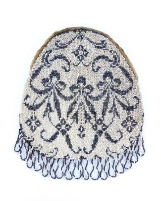 Beaded bag entirely embroidered with glass beads forming the same pattern from both sides: black garlands with stylized flowers and bows on white background. The bottom is decorated with a tassel fringe. The purse is lined with beige cotton and has a small pocket inside.