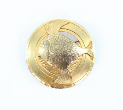 Large round golden metal brooch, in Art Deco style, representing a gold fish in the center in hammered technique on openwork ring background.