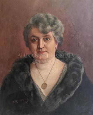 Painting portrait of a middle-aged woman known as Blanche Thérèse BANON, born in Oraison in 1877, married in 1917 to Paul Marius de TILLIA, marquis d'OLLONNE (also spelled d'OLONNE) (1869 - 1953), industrial and realtor. The lady is represented in a fur trimmed dark coat over a V-neckline grey evening dress, decorated with rhinestones. She is wearing a chain with a medallion, on which a crown with a hardly visible coat of arms are engraved.