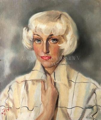 Painting portrait of a woman with a short square hairstyle of platinum blonde colour with a fringe, and bright red lips, wearing an oversize white shirt with black square tartan pattern.