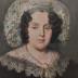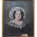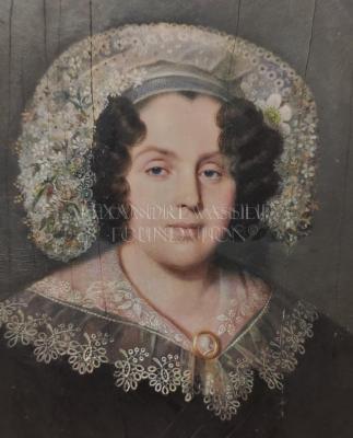 Half painted portrait representing a young woman wearing a dark brown colored dress and surrounded by a golden brass rectangular shape buckle. She is wearing a large and spectacular lace hat with a floral pattern and dotted with fresh flowers letting seeing curly hair framing her face. On her shoulders, she wears a white lace fichu with satin stitch embroideries, retained at the bodice by a cameo. She holds in her hand what seems to be a fan (The fact that the fan and the hand were cut suggests that the painting had to be larger and later cut to fit into the golden frame).