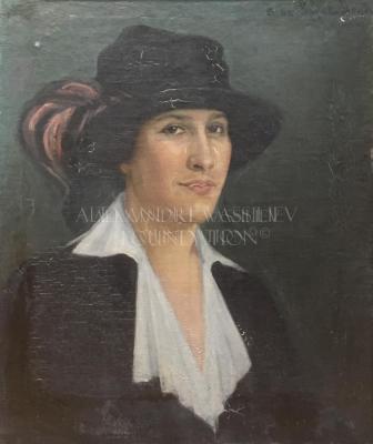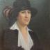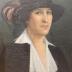 Painting portrait representing a young lady in a black dress with white collar, and wearing a black hat decorated with a dark pink feather.