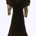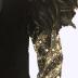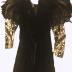 Concert dress in black colour velvet with large shoulders on shoulder pads, decorated with black feather. Sleeves are long and richly adorned with sequins, glass beads, and rhinestones. From the wardrobe of Hülya SOZER, Turkish singer, which she wore for concerts of her album "Bir Mektup, Bir Resim" in 1989.
