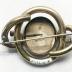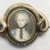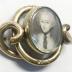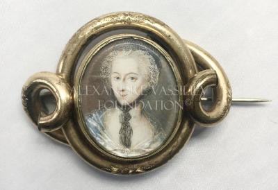 Gilded metal brooch in the shape of a large ring with a scroll from each side with engraved floral motifs, embellished with a miniature portrait, representing a woman of the 1750s, in a blue dress with white Valenciennes lace shawl, black Chantilly lace bonnet on white hair. The mecanism of the medallion allows it to turn around, leaving space on the back for a lock of hair.