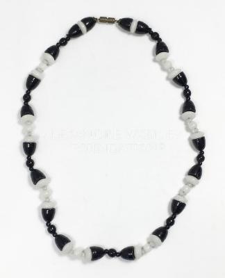 Short Art Deco style necklace consisting of black and white glass bead stones of cone and round shapes.