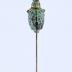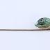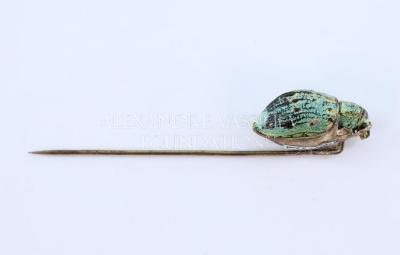 Brass lapel pin composed of a small rod topped with a natural Chrysochroinae type beetle. It comes in its original case on a layer of wadding.