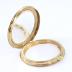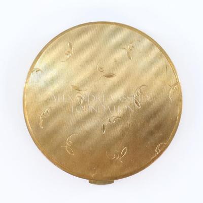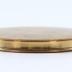 Round brass compact, decorated on the top with an engraved striped motif with a pattern of stylized feathers. It has a mirror inside over a compartment for powder.