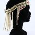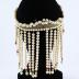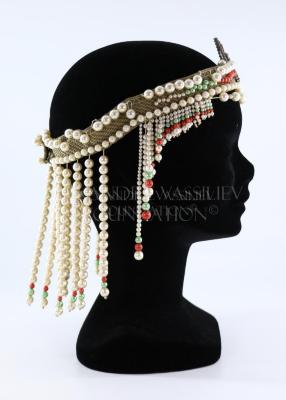 Cabaret or evening masquerade hairdress, consisting of a fabric band trimmed with metal thread, embellished with pearl strands of white, red and green colours, with pending pearls on the sides and the back, and decorated on the front with a metal ornament in the center.