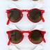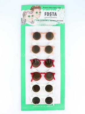 Fosta Sportswear children sunglasses display card with 6 pairs of rounded glasses in three different colours - semi transparent salmon pink and red, and opaque white. On the top of the cardboard, an image representing a little girl and a boy wearing different models of eyeglasses.
