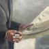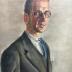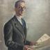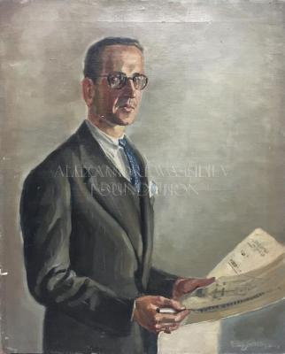 Painting portrait of a man known asĀ Pierre MARSAT, represented standing in a dark grey costume with a white shirt and a blue tie, holding a newspaper and wearing a pair of glasses.