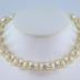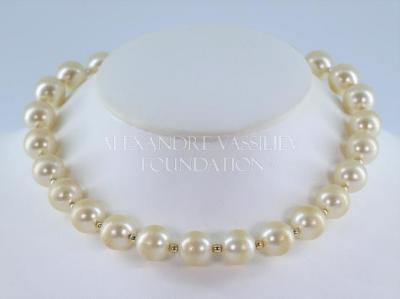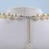 Short choker type one strand necklace made of large round pearl beads separated with tiny round silver beads. The necklace closes with a hook type clasp and a short chain with a pearl at the end.