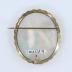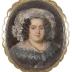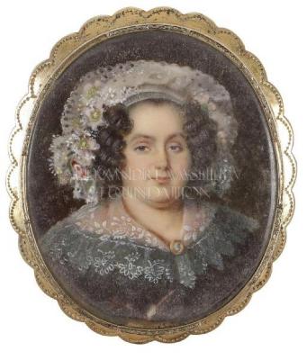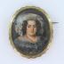 Oval miniature portrait, mounted into a silver brooch with mother of pearl back, representing a young woman in a dark brown colored dress, wearing a large and spectacular lace hat with a floral pattern and dotted with fresh flowers letting seeing curly hair framing her face. On her shoulders, she wears a white lace fichu retained at the bodice by a cameo.