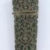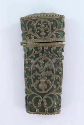 Small travel kit case on green lacquered wooden base with openwork silver design of rococo scrolled patterns and central decoration of floral vase from both sides on the top and the bottom. Inside tools are missing.